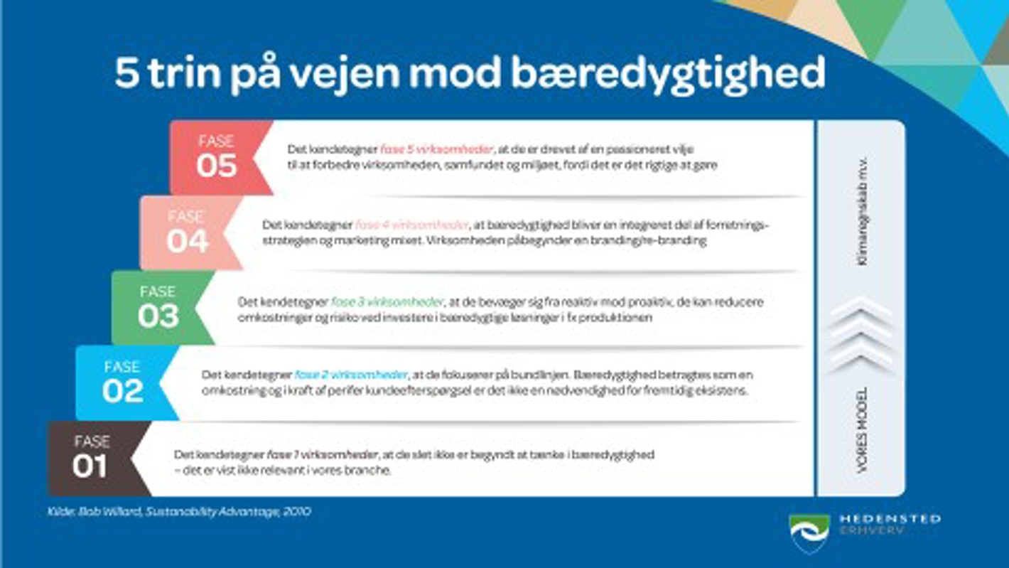 Hedensted Erhverv arbejder målrettet på at motivere og hjælpe lokale virksomheder med bæredygtighed. Der er følgende fem trin på vejen mod bæredygtighed: